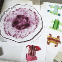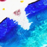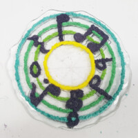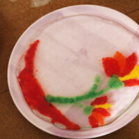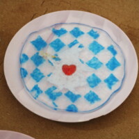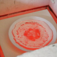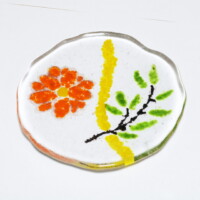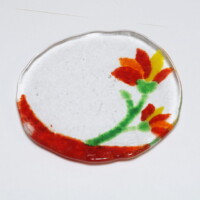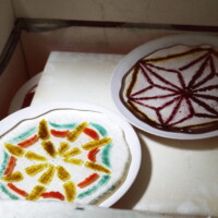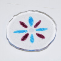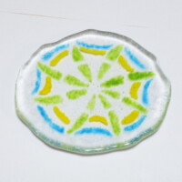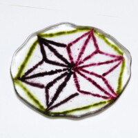 一度目は、平らな透明のガラス板の上に色の粉てデザインした模様を溶かし合わせて、